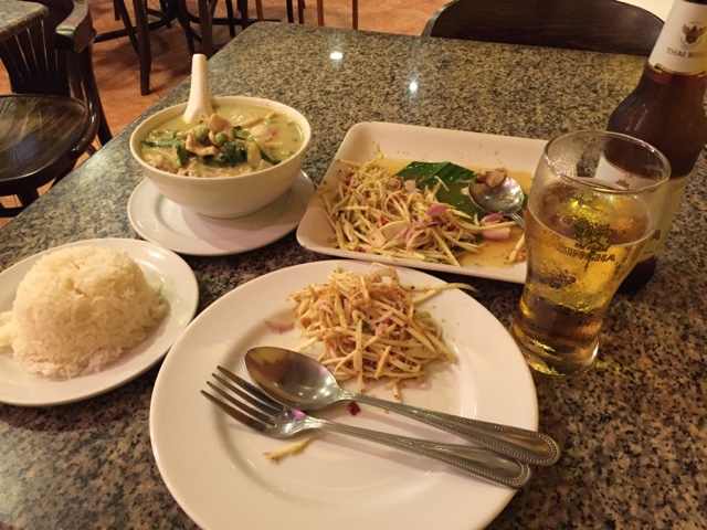 I walked Convent Street which has a bunch of local restaurants and a few western (there is an Irish pub). I was hungry so I stopped for some Thai delights. Green mango salad and green chicken curry.